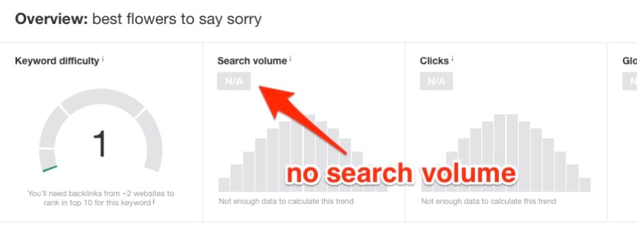 For example, “best flowers to say sorry” shows a search volume of N/A in Keywords Explorer 2.0.