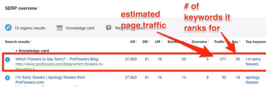 For example, if we look at the top ranking page for “best flowers to say sorry” (this can be done with the SERP overview feature in Keywords Explorer 2.0), you’ll see that it ranks for a number of other keywords. It also has estimated traffic of 280 visits/month.