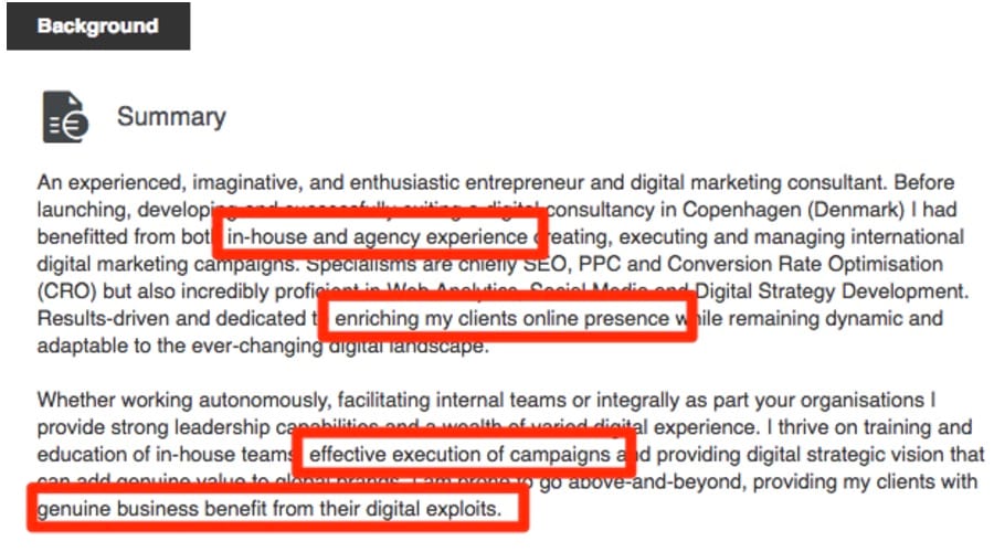 If you’re in the B2B space, you can also find keywords on LinkedIn profiles, as people usually have a lengthy description of their skills, interests, and experience in relation to the industry.