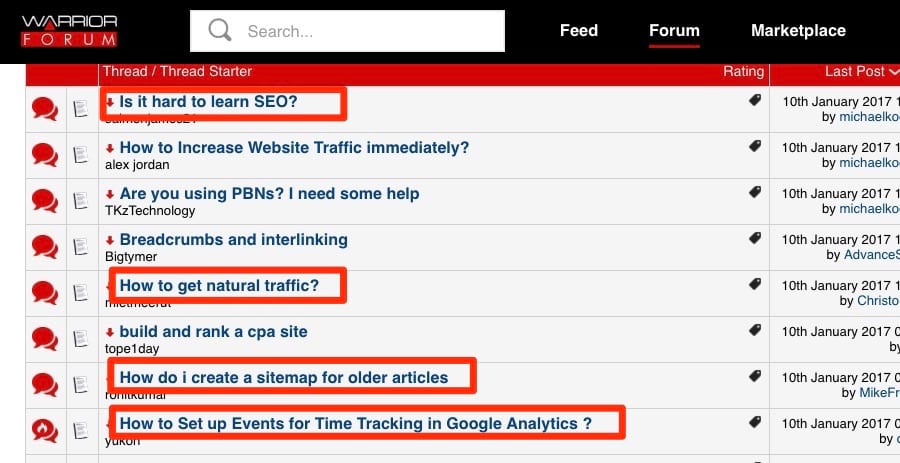 Within seconds of viewing the threads on the Warrior Forum, potential keywords and questions start to jump out.