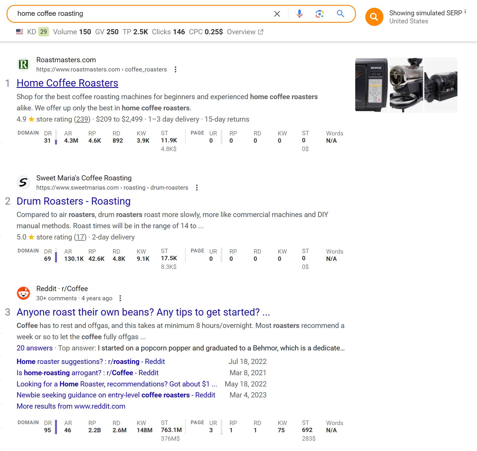 You can check the intent of a keyword by looking at the search results. “Home coffee roasting” has a mixture of roasting machines for sale (commercial intent) and a Reddit discussion about roasting beans at home (informational):