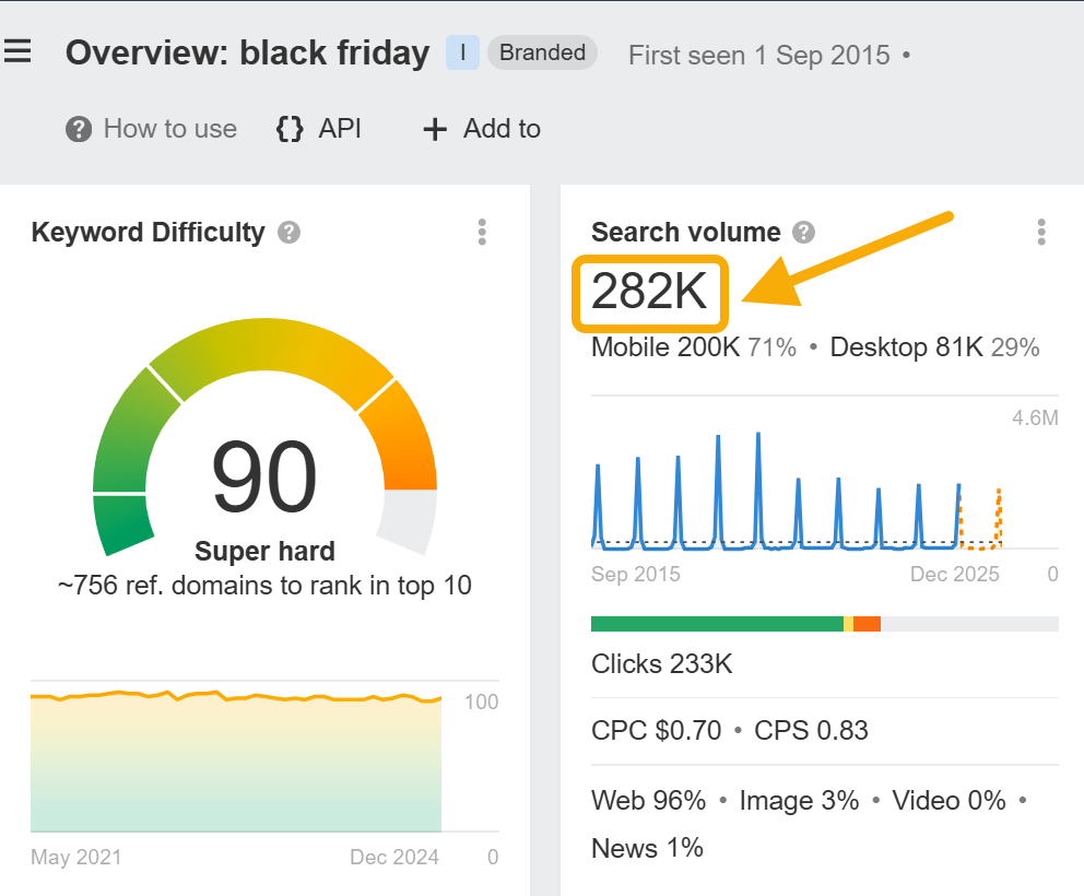 Or take a seasonal keyword like “black friday”. The average search volume shows as 282,000, but this average comes from many months of much lower search volume (around 50,000 most months) and one month of much higher volume (2.5 million searches in November 2024):