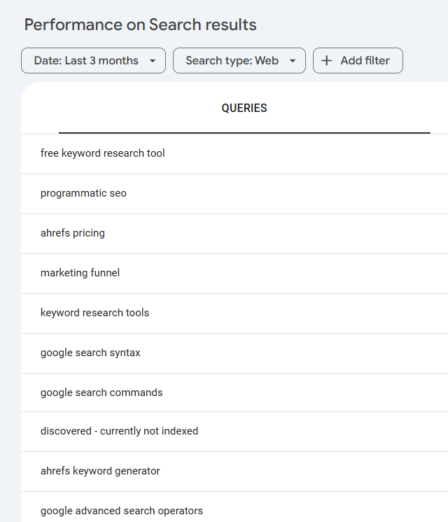 Once you’ve set it up, Google Search Console will show some of the search queries that your website is currently ranking for and getting clicks from.