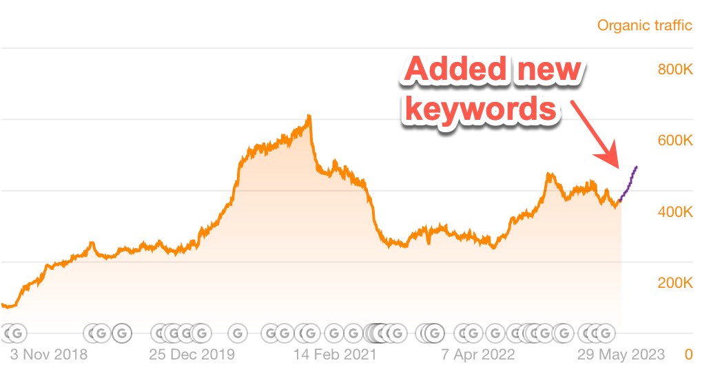 Second, the new keywords that we’ve added to our database in this update might cause a spike on the traffic and keyword graphs for some websites: