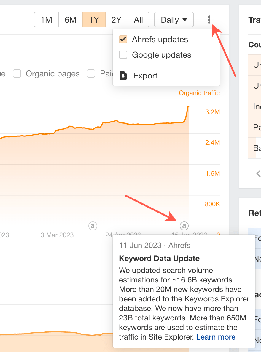 Please also make sure to activate “Ahrefs updates” notes on the graphs in Site Explorer, so that you could easily see if the traffic spike was caused by our latest database update: