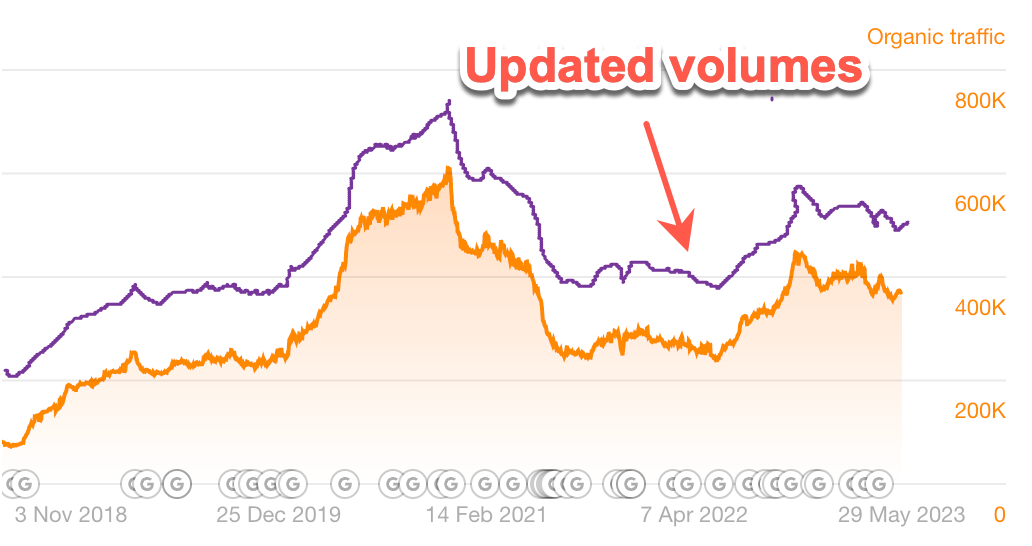 Because of that latest database update, our search traffic estimations are further off than they were before (according to our internal research). We plan to improve this in the upcoming database update, so you can expect the traffic estimations in Ahrefs to increase across the board once it’s rolled out.