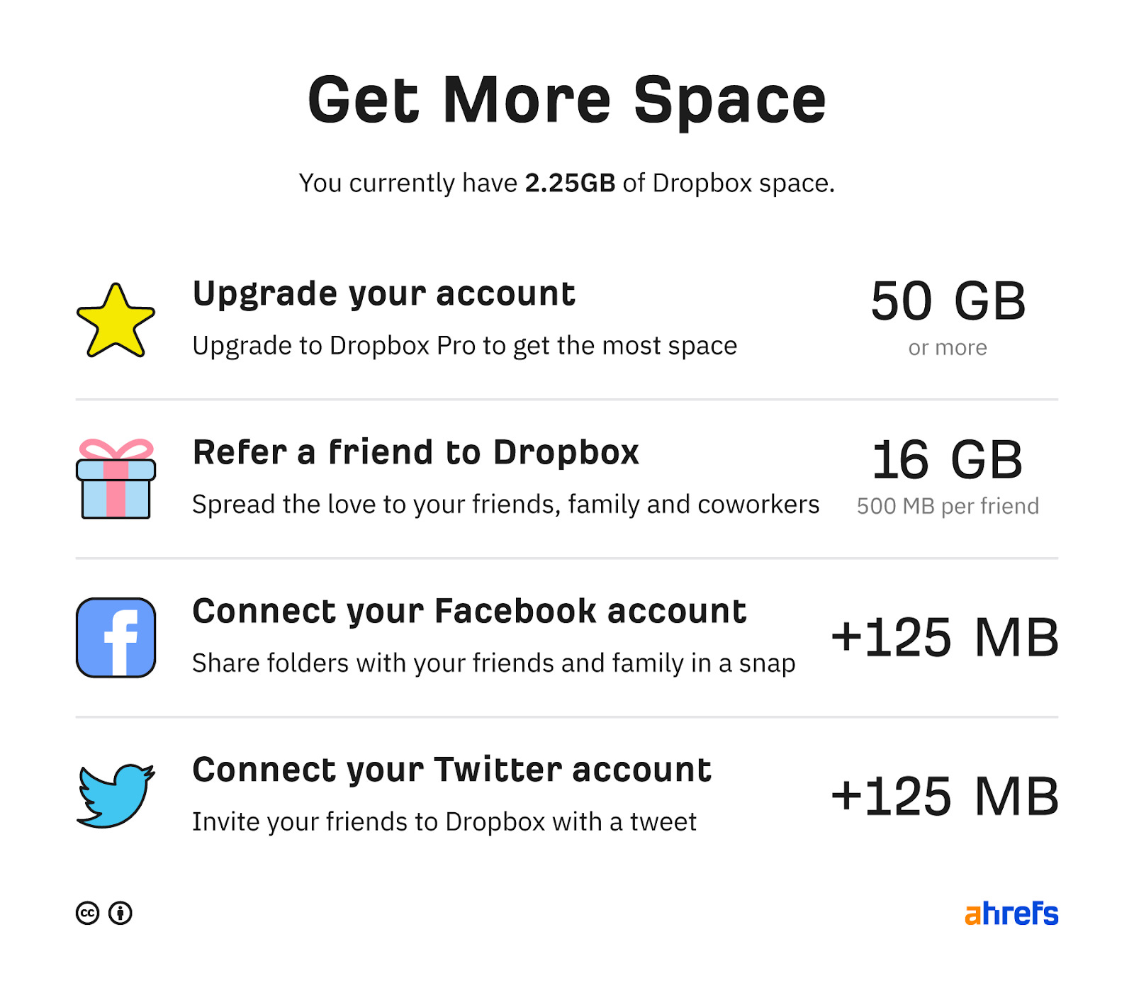For non-cash incentives, there are a variety you can choose from. You can give away discounts, store credit, your product, or more. The most famous example is Dropbox’s referral program. They gamified the entire process by offering more storage space for each successful referral.
