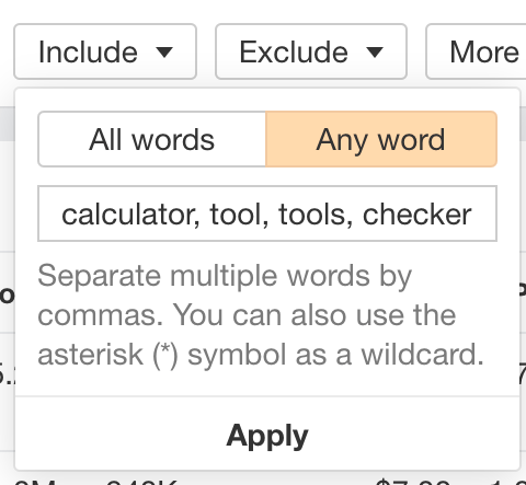 Then, go to the Phrase match report and add words like calculator, tool, tools, and checker to the “Include” box.