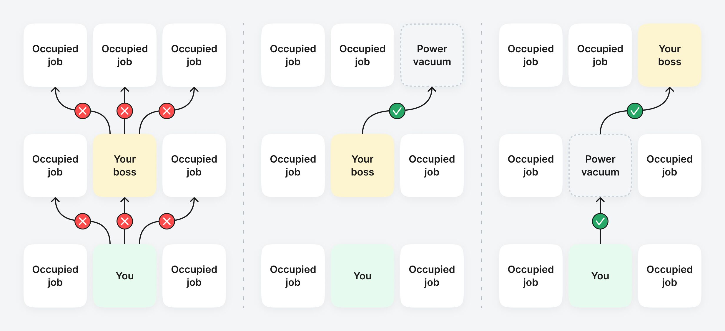 I used to imagine promotion as a hand-over-hand vertical climb through the ranks of an organisation. My actual experience has been the opposite: most of my promotions came as a result of slipping into the “power vacuum” created by my manager moving into more senior roles.
