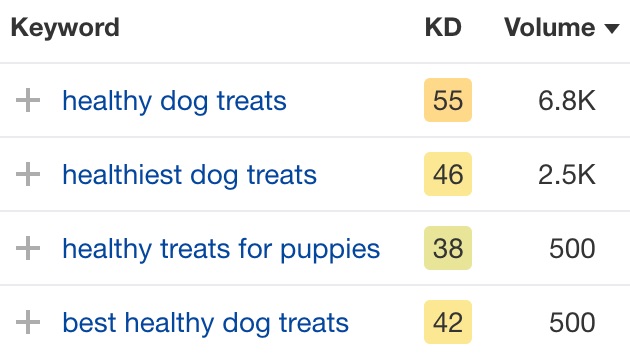 As you can see in the screenshot above, this long-tail keyword has a much more popular variation: “healthiest dog treats” (2.5k searches). And if you manage to rank for that search query, you’ll automatically rank for its supporting long-tail keyword too.