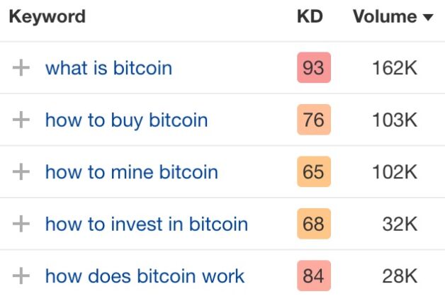 Let’s say you’ve just launched a blog about cryptocurrencies. There are lots of popular keywords with high search volumes that could potentially drive LOADS of traffic to your blog: