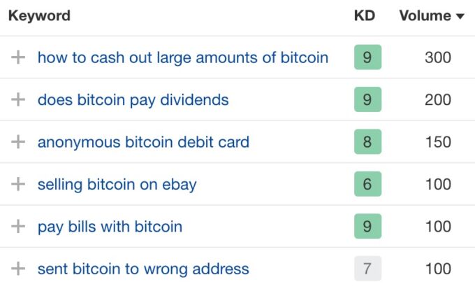 Now let’s look at some of the less popular search queries for the topic of bitcoin: