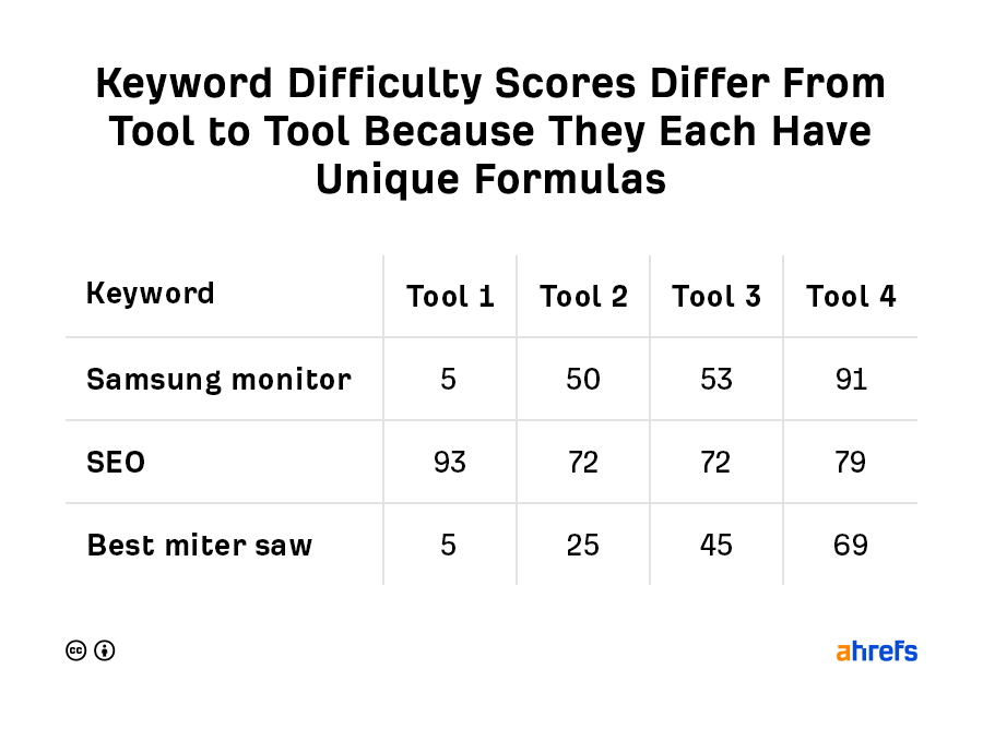 It’s also important to understand that each SEO tool uses a unique formula for their keyword difficulty score, which is why scores are often vastly different from tool to tool: