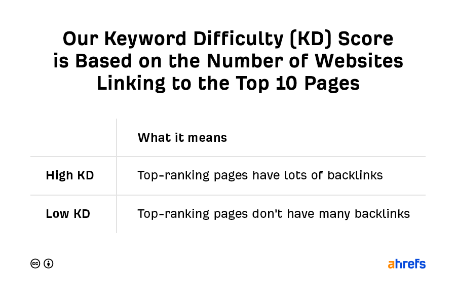 At Ahrefs, our Keyword Difficulty score calculation is simple: we take a trimmed mean of the number of referring domains (linking websites) pointing at the top 10 pages. That means the top-ranking pages for high KD keywords have many backlinks, and the top-ranking pages for low-KD keywords have few backlinks.