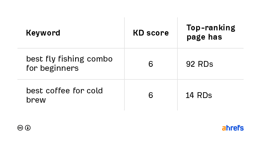 In conclusion, all else being equal, it would probably be easier to outrank the page with 92 RDs than the page with 14 RDs. So despite having the same KD scores, “best coffee for cold brew” is arguably a less competitive keyword than “best fly fishing combo for beginners.”