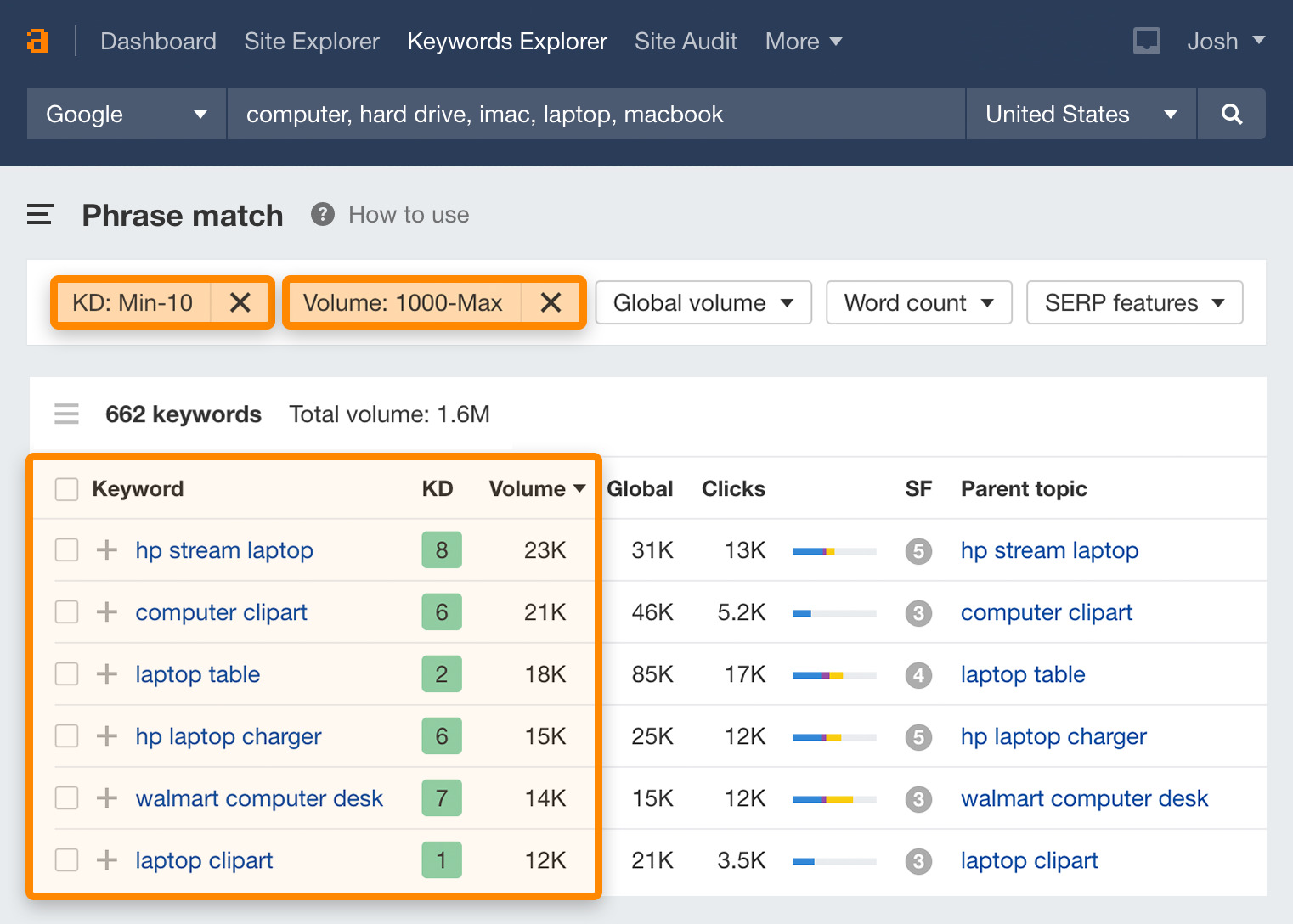 In the Phrase match report, filter for keywords with a KD score between 0-10 to find “low-competition” keywords.