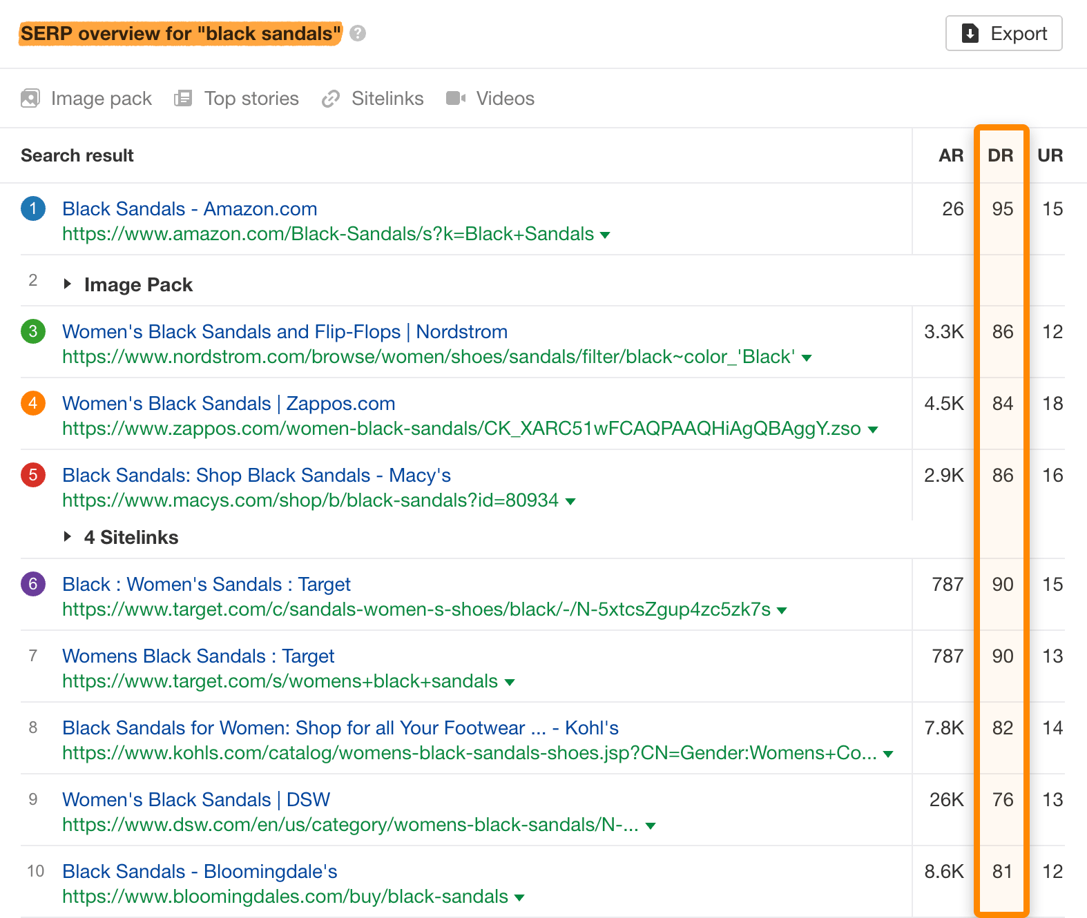 Either way, you’ll notice that for some seemingly low-competition keywords with low KD scores, all of the top-ranking pages come from very high DR websites.