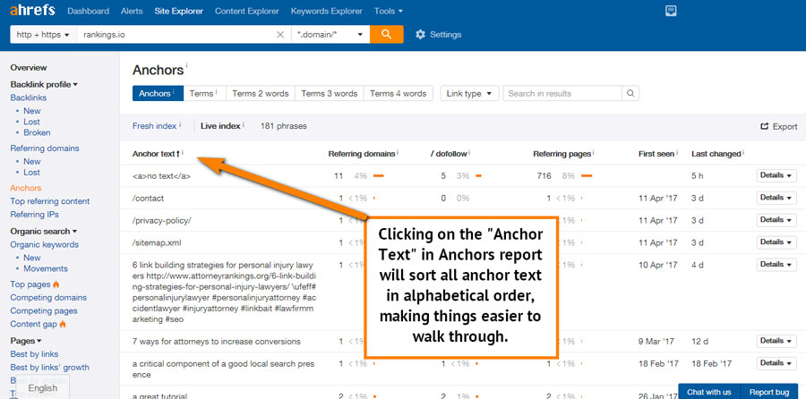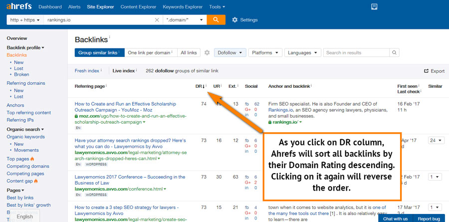 In the backlinks report in Ahrefs, we sorted referring domains by Ahrefs Domain Rating and anchor text in the following ways: