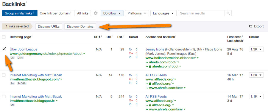 You can add domains or URLs to your disavow list directly from the backlinks report, as you inspect your backlink profile. Then you can easily export your disavow list from Ahrefs and import it into Google Disavow Tool.