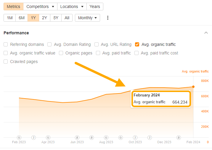 Hovering over the next month, February’s organic traffic was an estimated 664,000 pageviews: