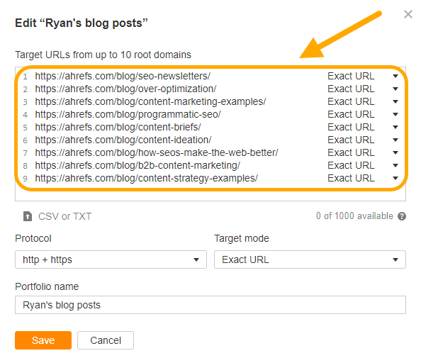 You can also use the Portfolios feature to measure traffic growth to collections of specific URLs, like this portfolio of my published articles…