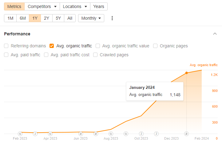 Head to Site Explorer, enter the website URL you’re interested in (setting the view to Path, Domain, or Subdomain, depending on which part of the website you’re analyzing), and choose the Monthly view for the Performance chart. Hover over the graph and you’ll see estimated organic traffic for each month.