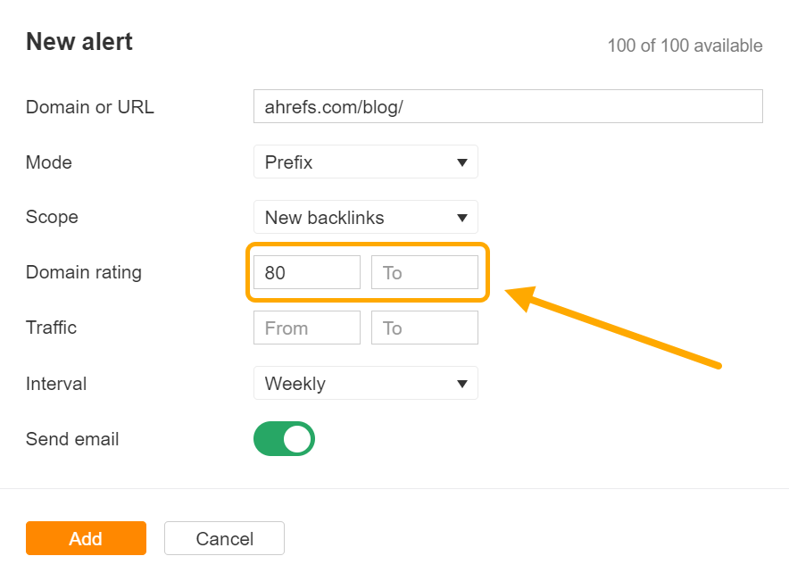 You can also use Ahrefs’ Alerts to get an automated notification whenever you gain a new link. In the example below, we’ll get a weekly notification summarising all new backlinks for ahrefs.com/blog/ from websites with a domain rating of 80 or above: