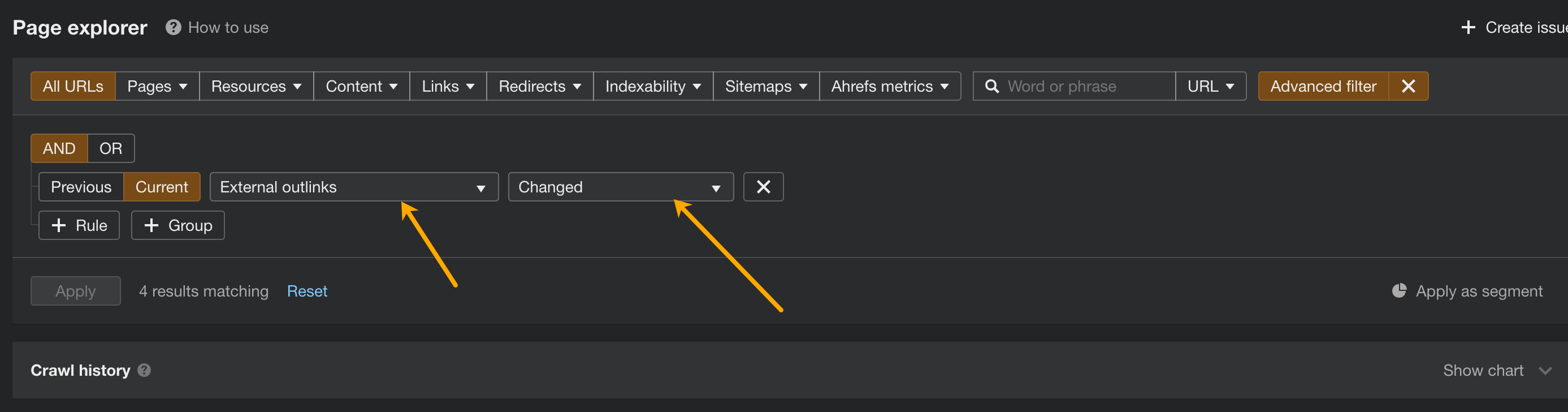 Here’s a filter that makes it easy to spot if someone has edited an existing page to add a new link to an external website: