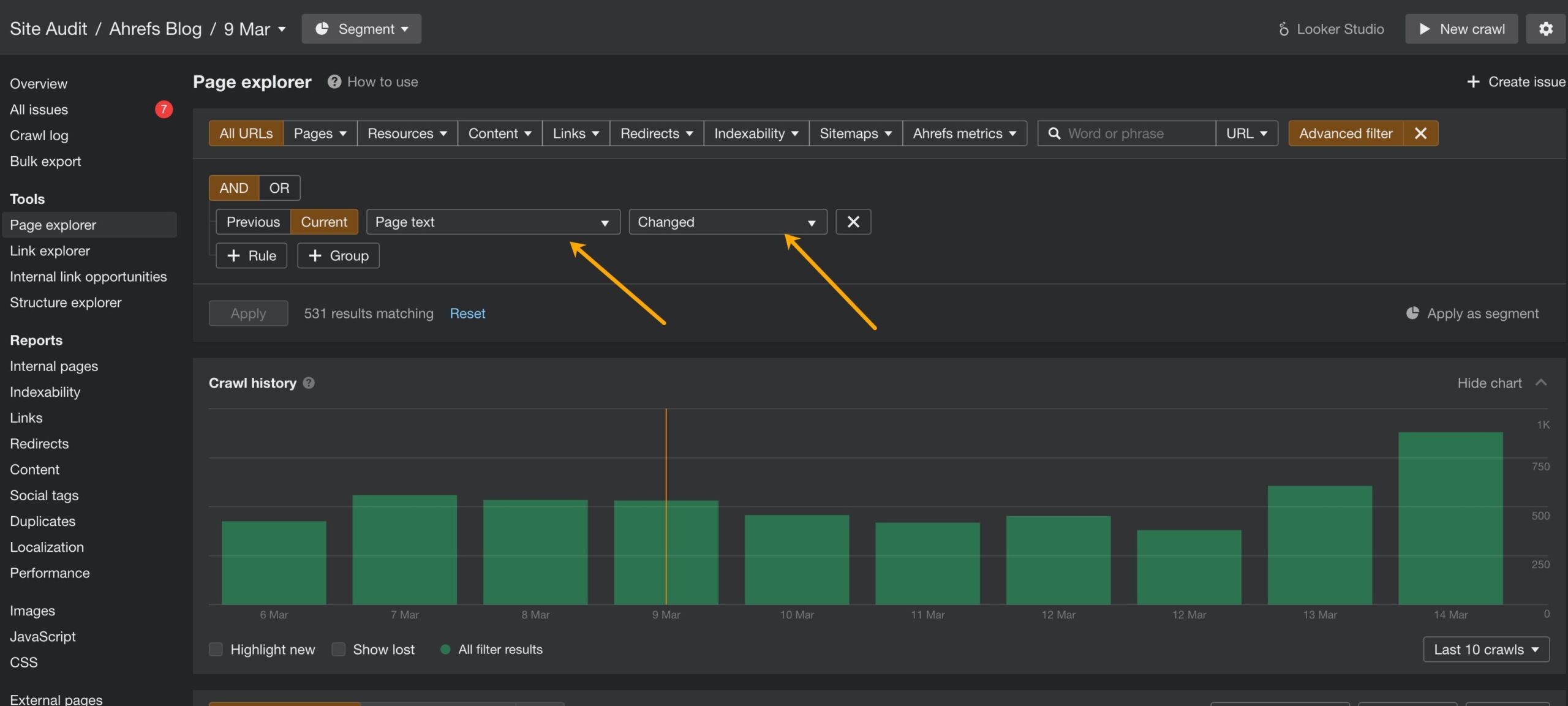 Open the Page explorer, access the advanced filters. There, select “Title” -> “Changed.”