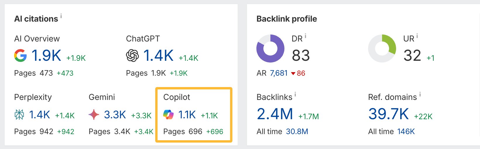 25 July: The AI citations widget at the top of Site Explorer’s Overview now includes Microsoft Copilot data from Brand Radar, giving you broader AI link coverage in one place.
