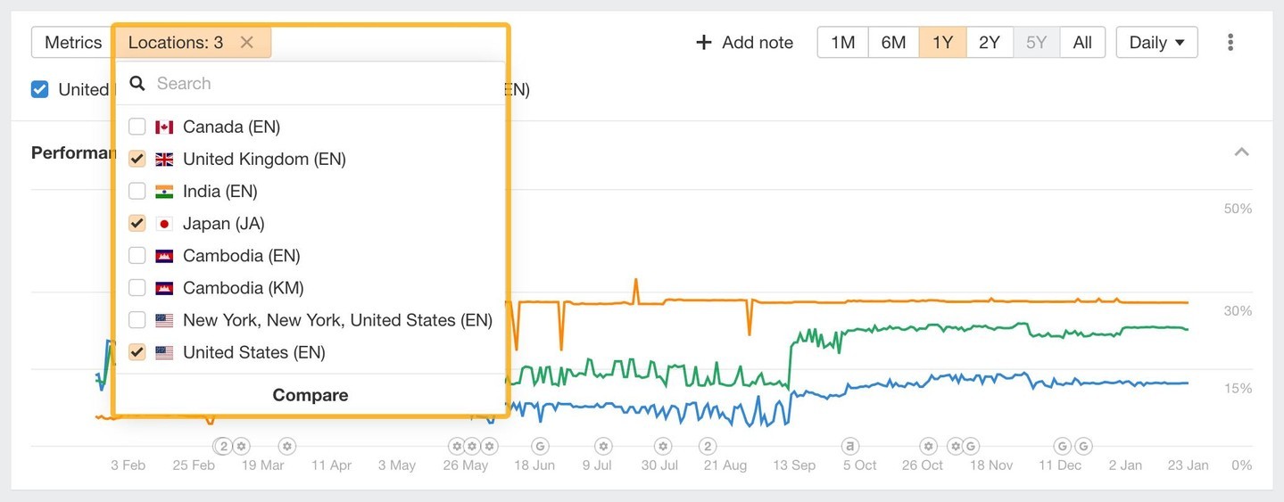 22 Jan: We’ve added a Locations mode in Rank Tracker Overview’s history chart that lets you track performance across locations in your projects.