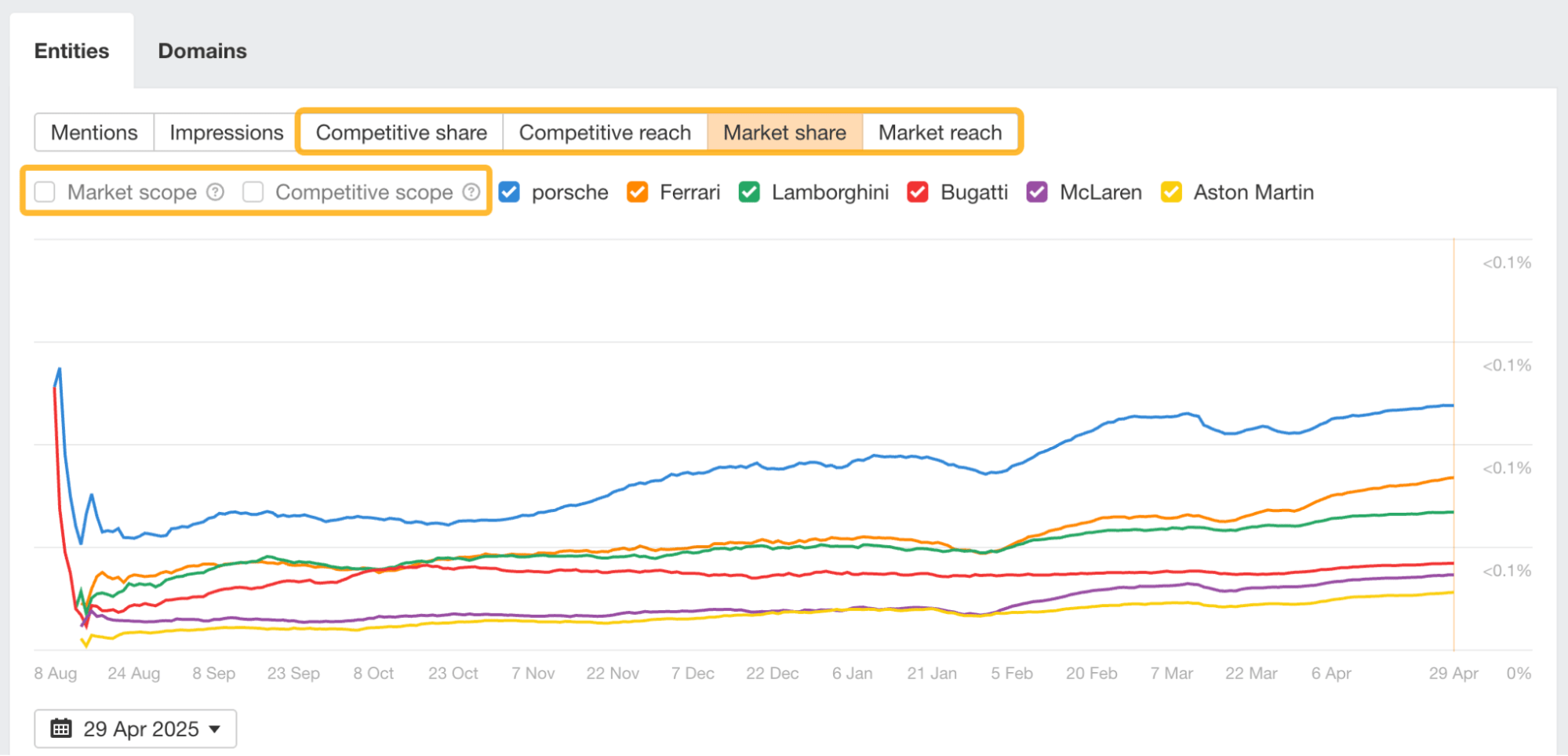 In addition to AI overviews, you can now analyze brand mentions across web content – powered by our 16billion-page content index. Just set your market scope, add entities, and go!