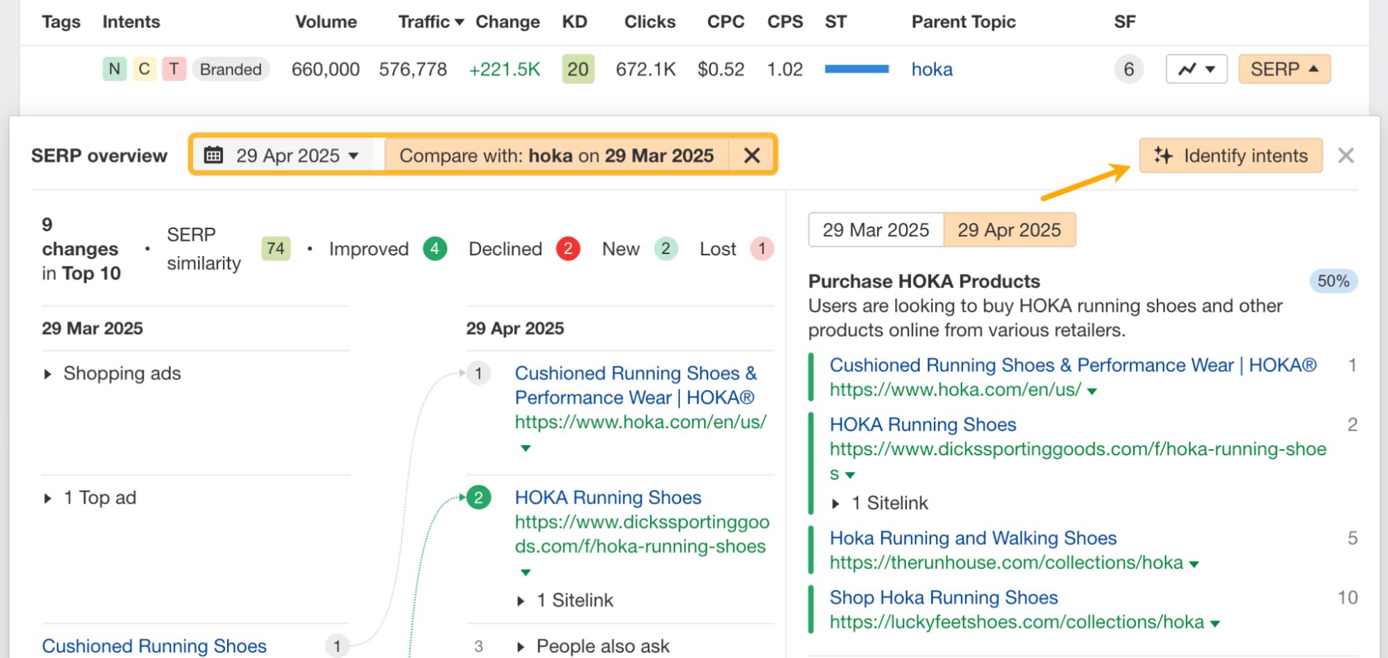 You can also open SERP overviews to compare time periods and hit “Identify intents” to track shifts in search intent over time — all right inside Rank Tracker.