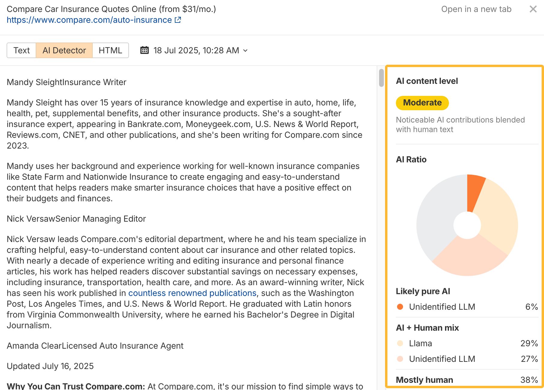 The improved AI detection is now built into URL details in Site Audit, so you can inspect content-level signals alongside technical issues. Bulk detection and filtering are next.