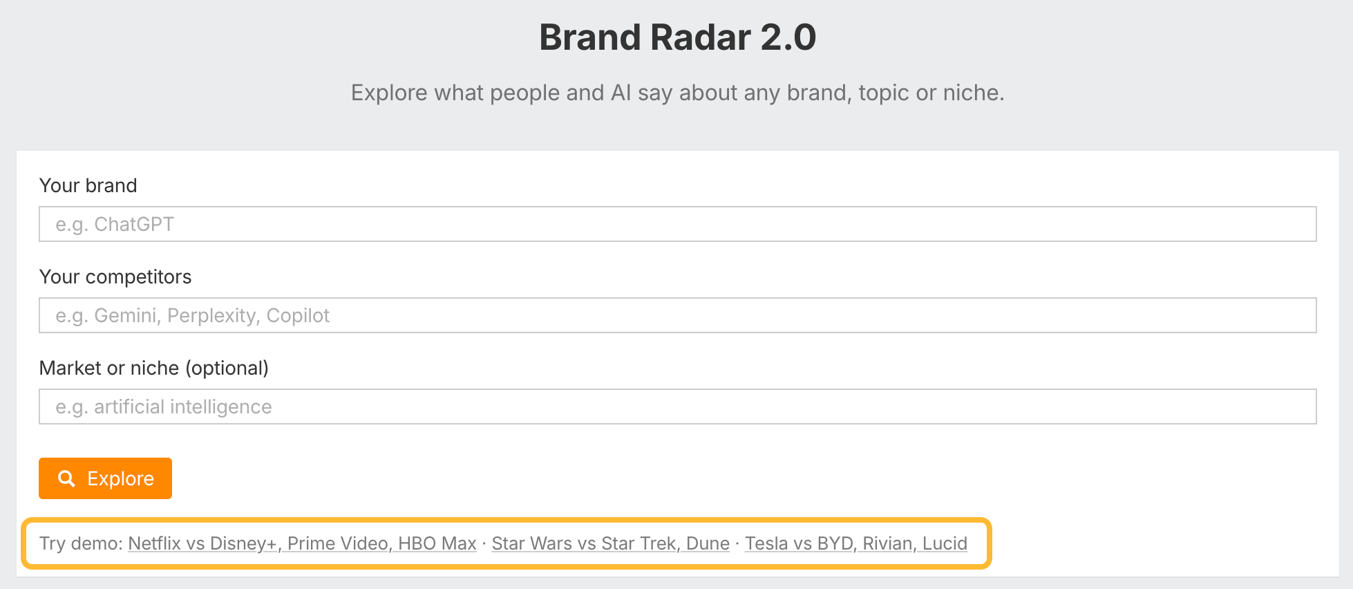 - Demo searches – Plus, all paid users get a set of demo queries to try Brand Radar for free.