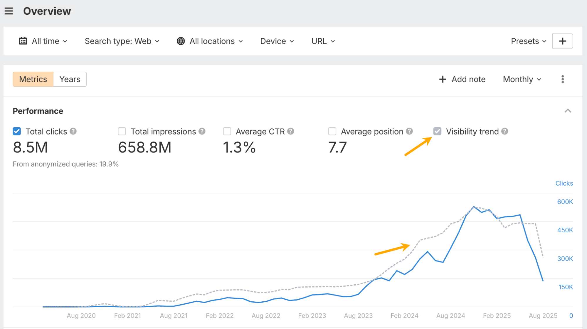 The performance charts in GSC Overview and dashboard now include a Visibility trend so you can quickly spot SERP shifts and see if they affect your traffic. Export if you need the detailed values.