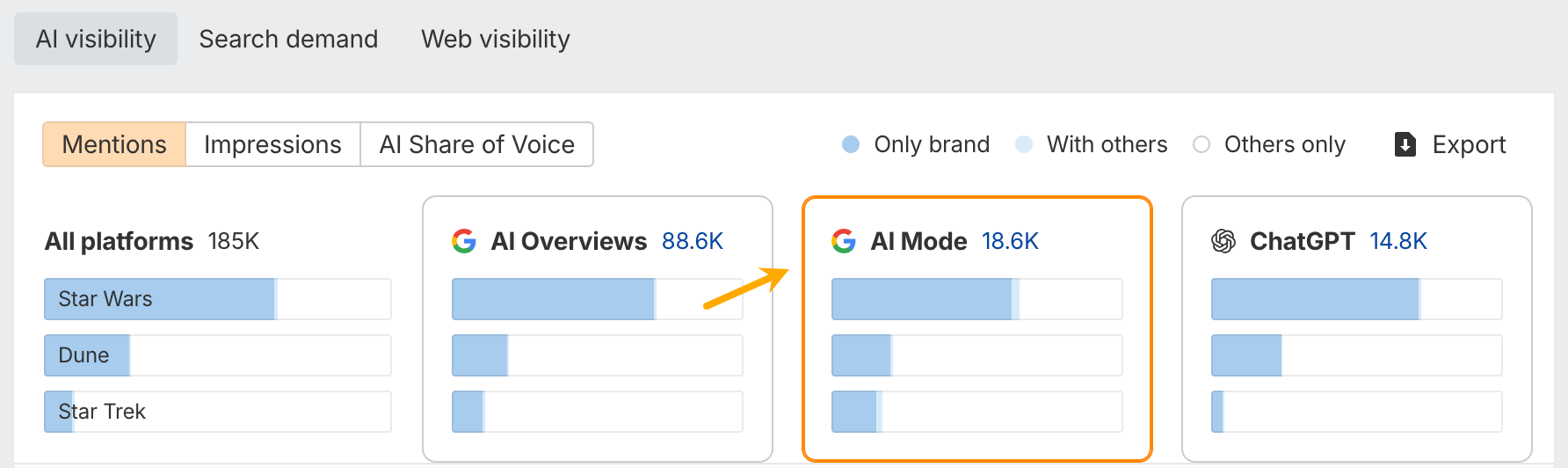 Google AI Mode is bundled with AI Overviews at $199/month, and it’s also included in the All Platforms add-on. If you’re already on those, your Brand Radar just got better at no extra cost.