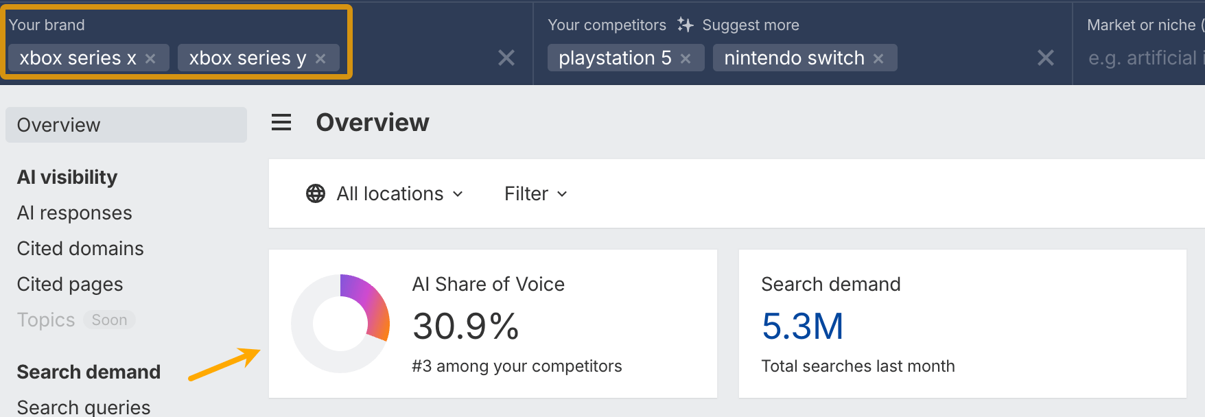 - Track multiple brands – add more than one brand to the “Your brand” field and see combined Share of Voice.