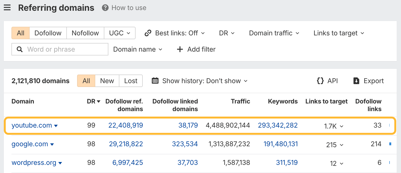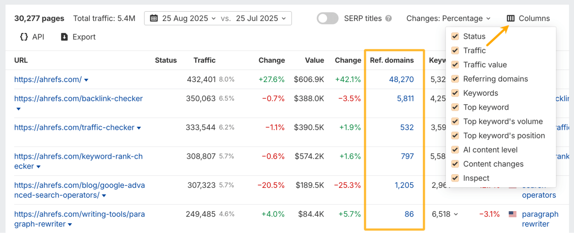 See the number of referring domains with history, and use the new Columns control to choose which metrics to display.