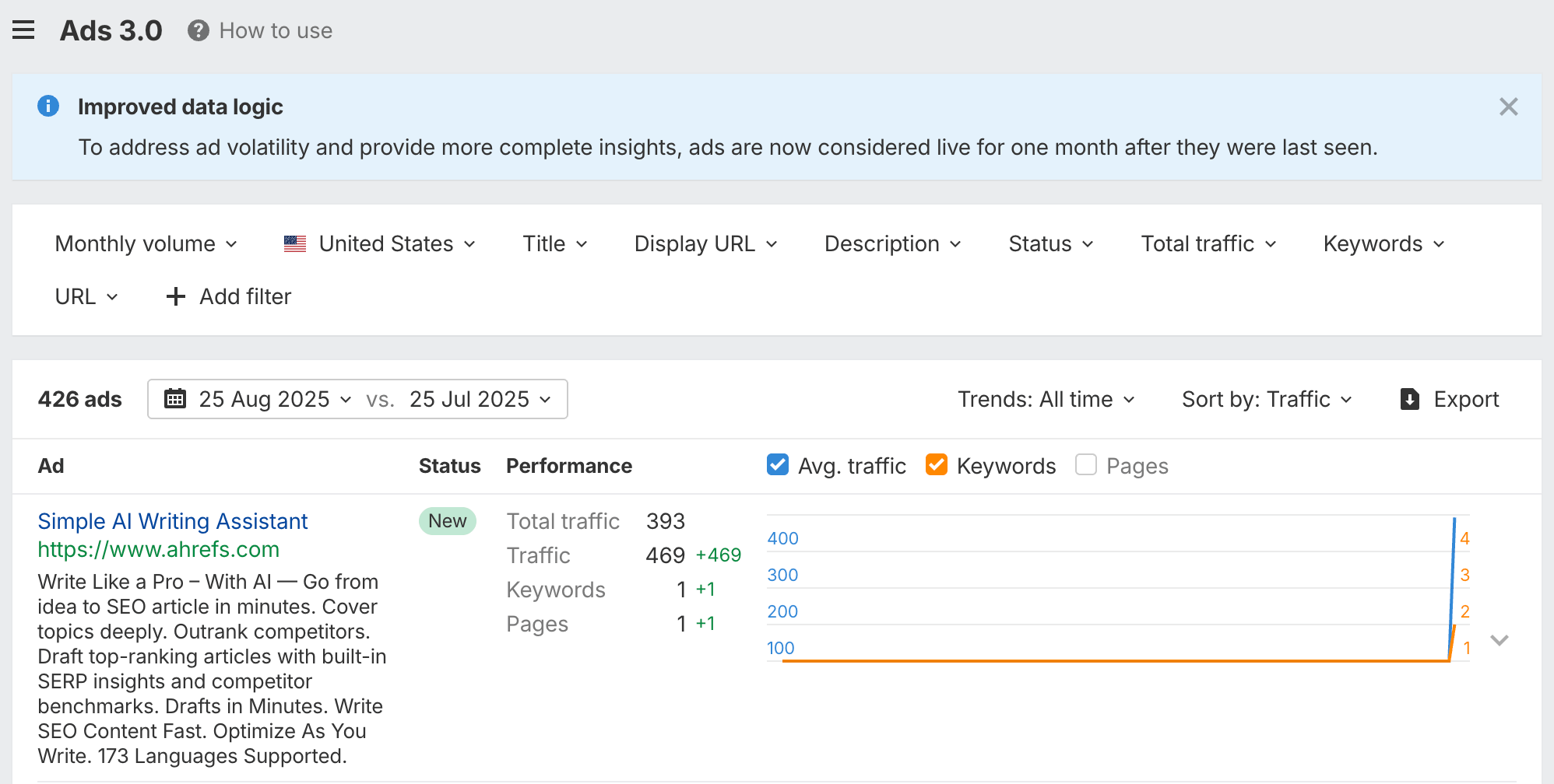 If your target isn’t found in the latest SERP, we look back up to one month and surface the most recent date that includes it – this means fewer gaps and a clearer view of paid visibility over time.