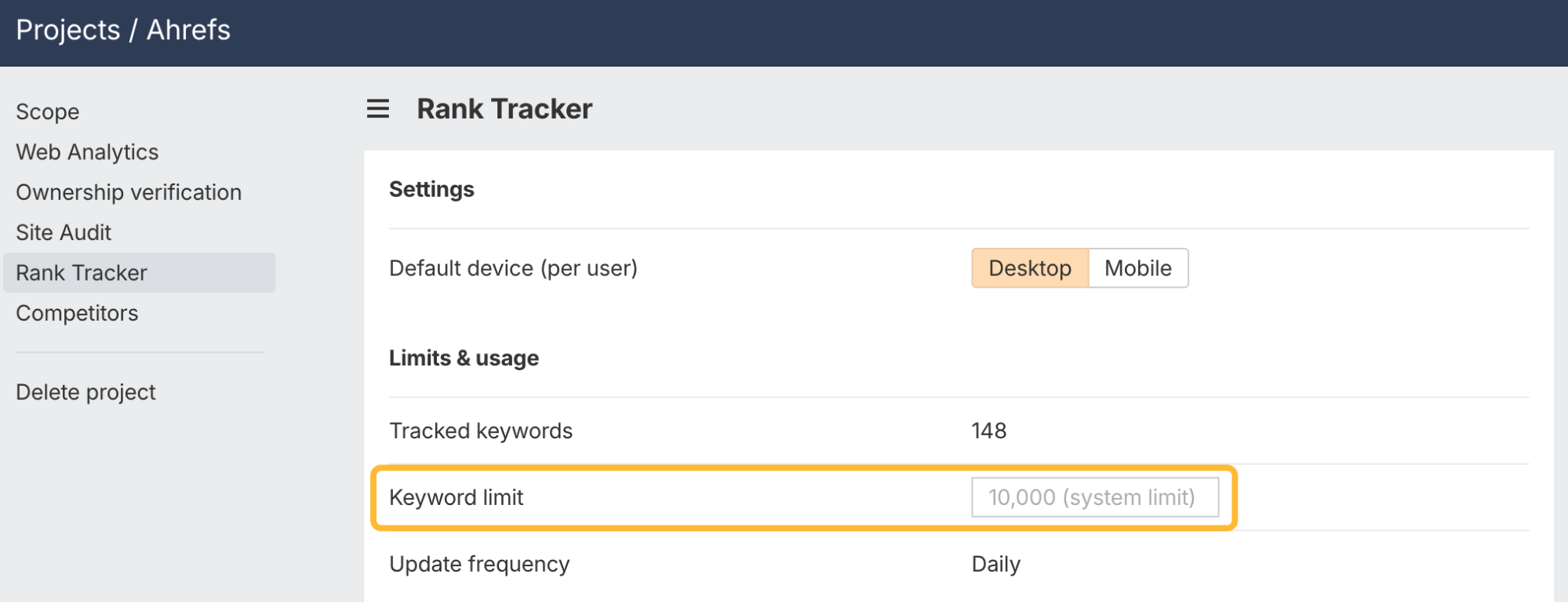 Set a cap on tracked keywords per project. This helps enterprise teams control scale, but it’s just as handy if you want to keep projects tidy.
