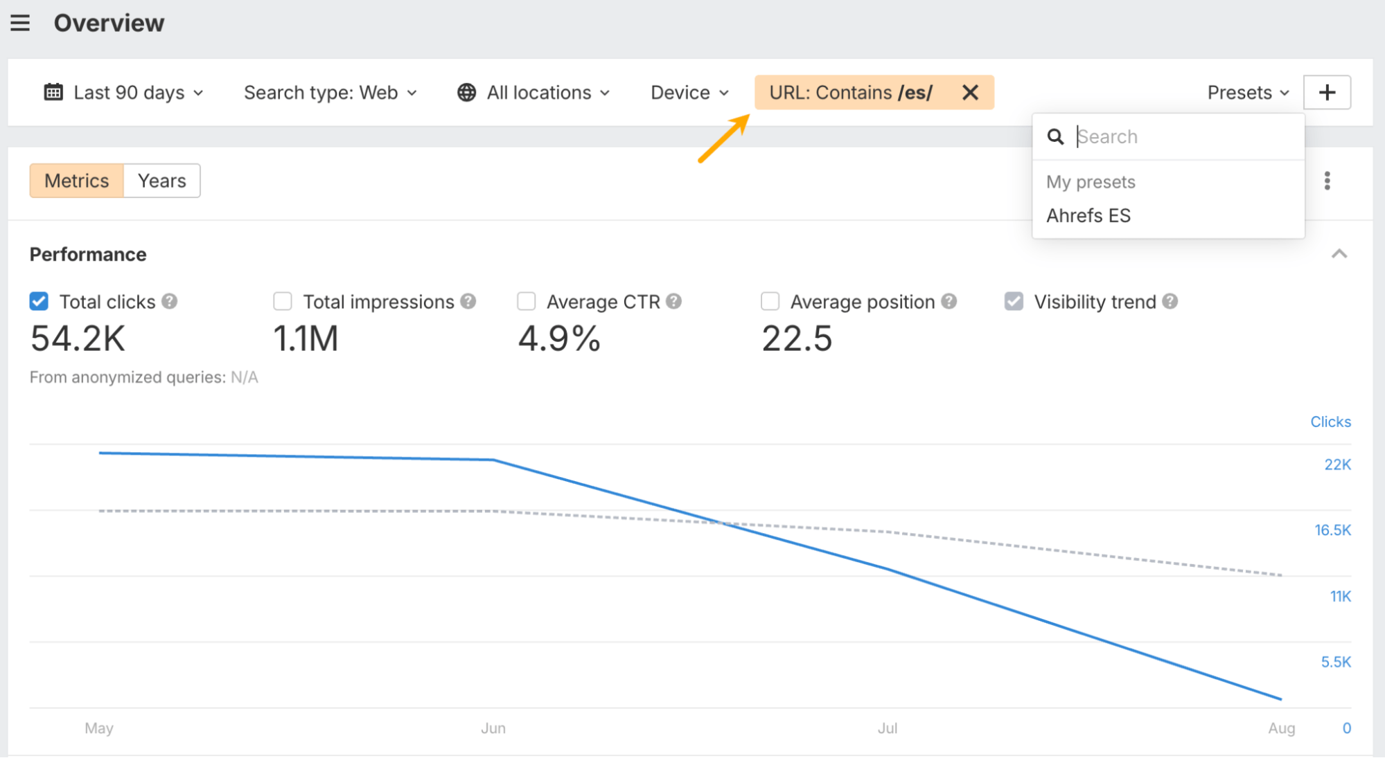 You can now filter by URL in Overview and Keywords. Paired with presets, this makes it easy to save page segments and jump back to their data anytime.