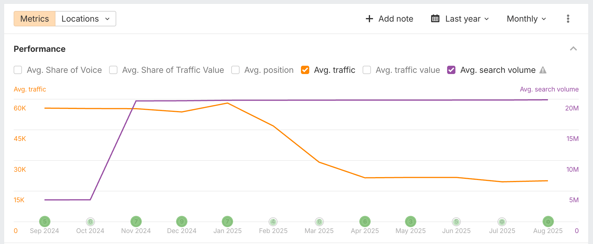 Performance Overview now shows a chart with the total search volume across all tracked keywords – a fast read on overall demand. For the most accurate picture, use Monthly volume mode.