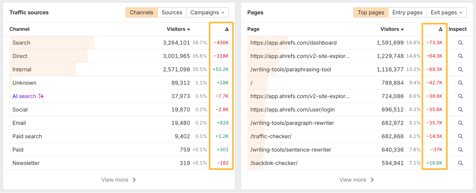 When you compare between dates, all reports will show a column with metric deltas. It’s a quick way to spot shifts and trends at a glance.
