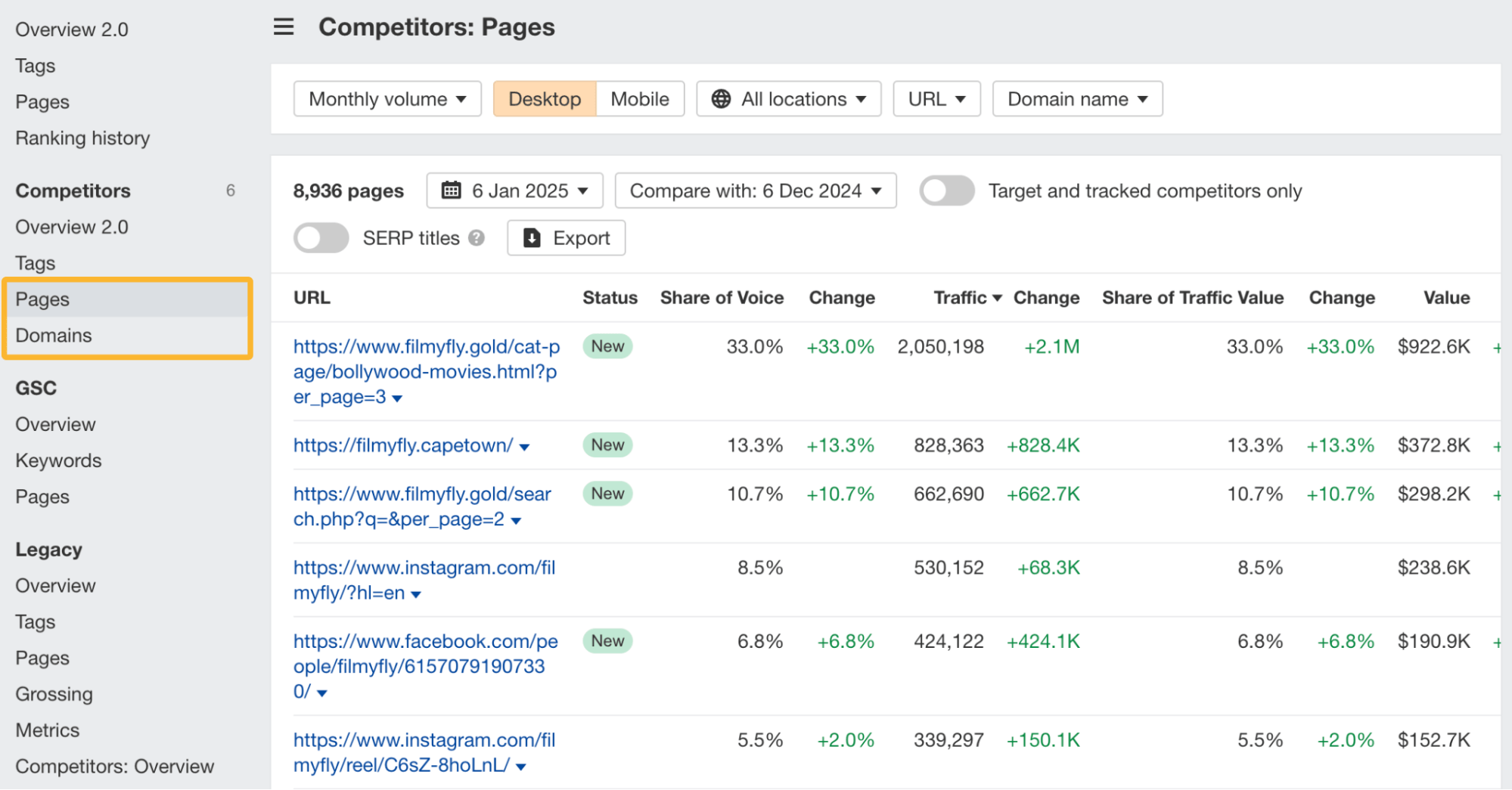 Before, the Competitors Pages and Domains reports were subreports of Traffic share. Now, we’ve made them more accessible right in the sidebar and added more metrics to them.