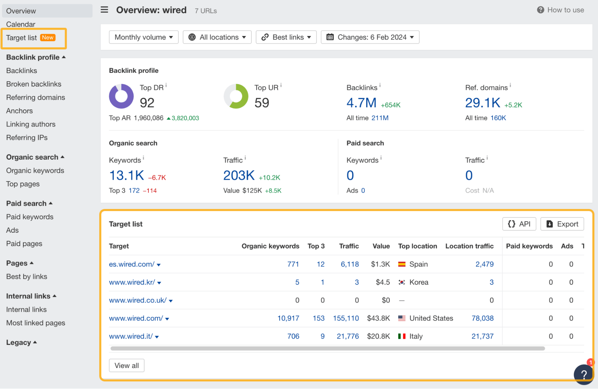 Compare a list of targets and see individual metrics with the new “Targets list” overview widget. Or, use the standalone report in Site Explorer.
