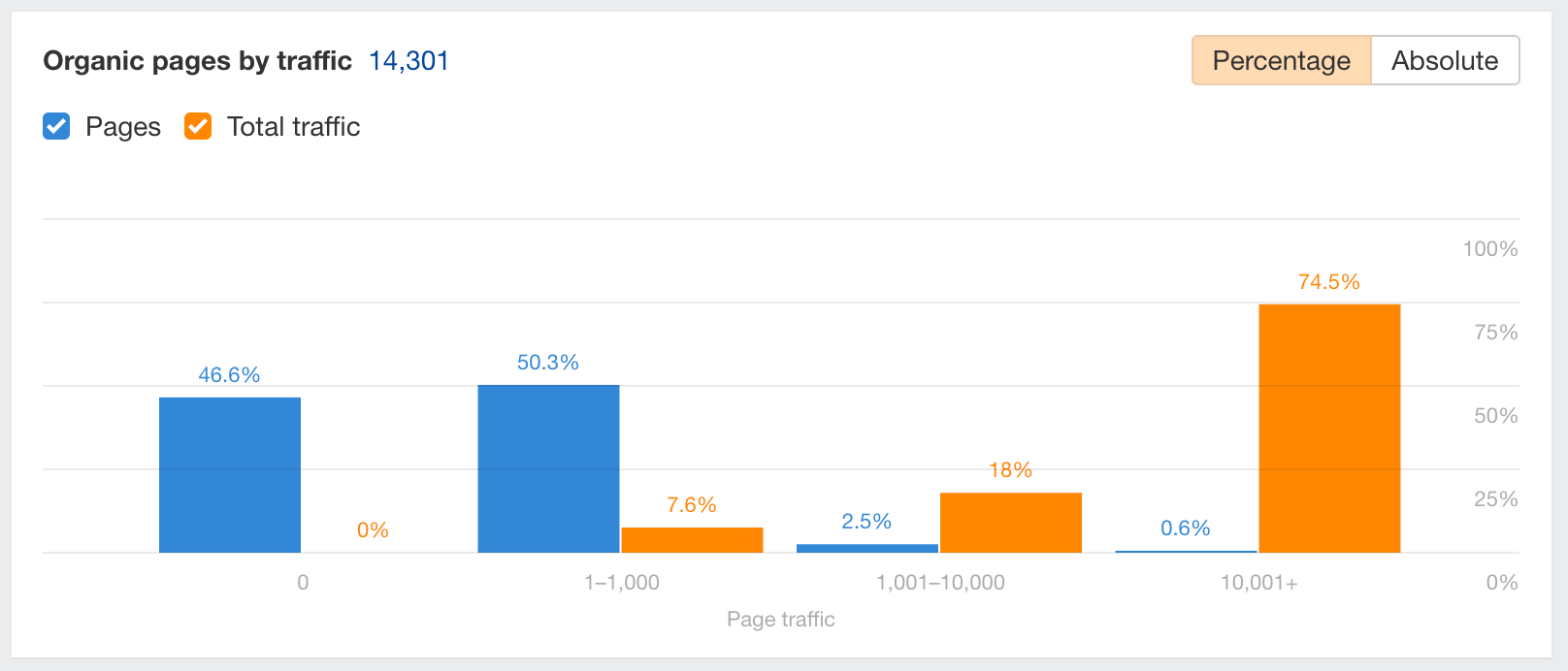 By looking at the amount of pages in each bucket and how much search traffic these pages are driving cumulately, you can understand the SEO strategy of a website. Very visual, very shareable.