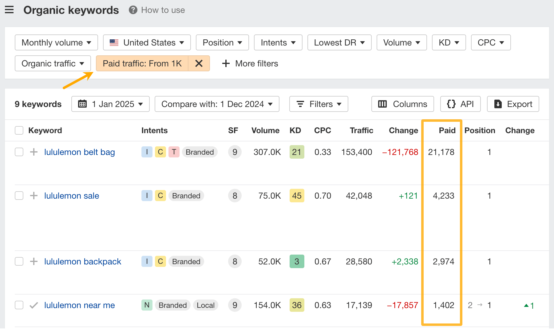 Use these filters in the Organic keywords and Paid keywords reports to: