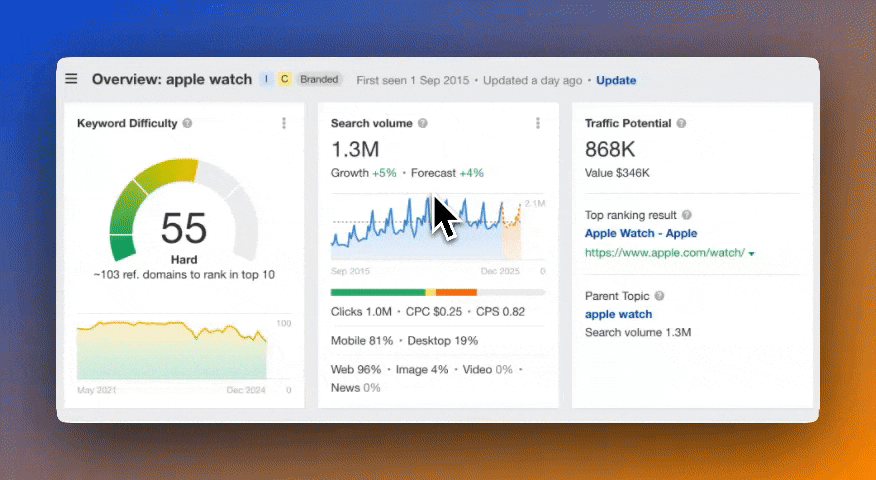 Use this 12-month search volume growth forecast in Overview and report tables to predict how keywords will trend in the future and zoom in on promising opportunities.