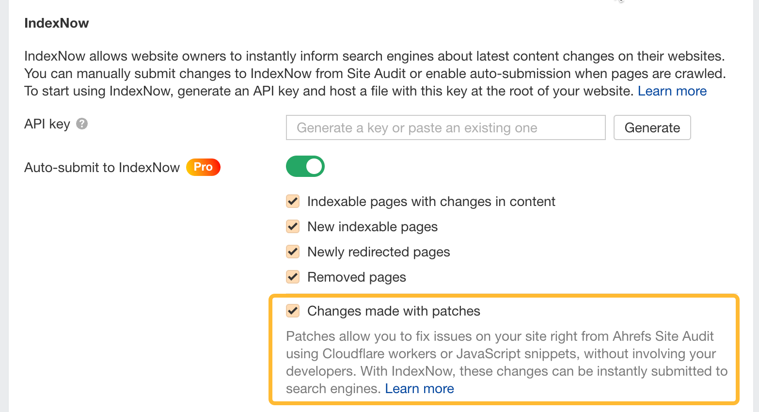 Enable this feature in Site Audit’s Crawl settings to auto-submit changes to search engines whenever you patch a page to fix an issue.